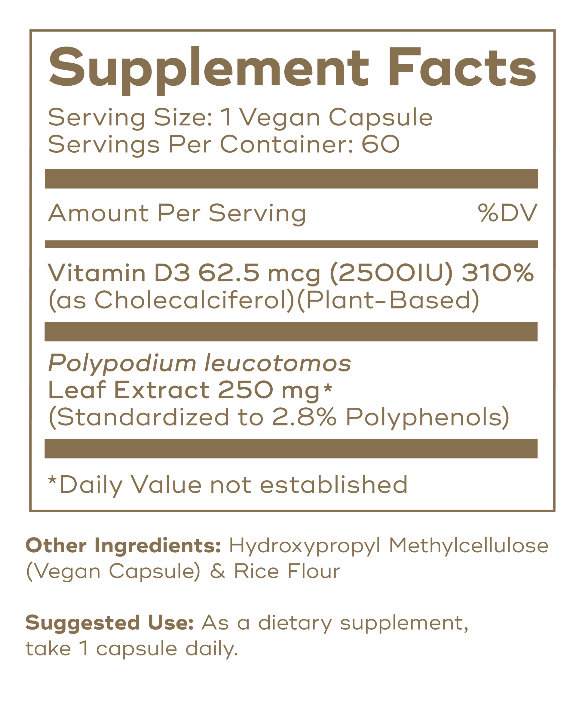 Ingredients: Polypodium Leucotomos Leaf Extract (PLE) + Vitamin D